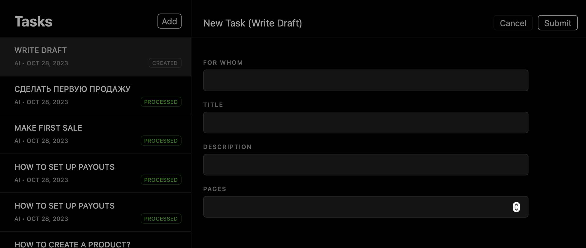 Prodmake Tasks help you utilize AI/LLM technology for “brainstorming” your ideas which either end up as drafts you can develop on top of or quickly scrap.
