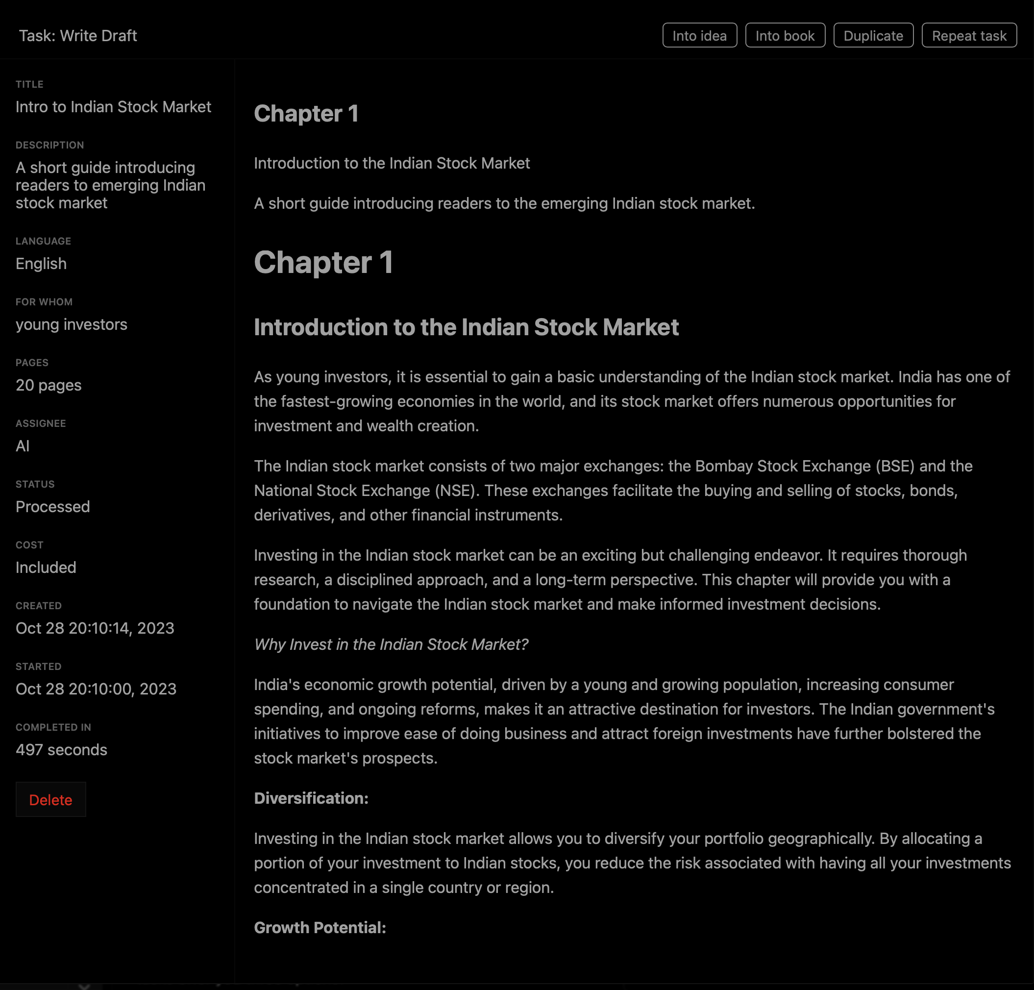 Once task is processed we now have ~10 chapters that we can turn into a long-form article using “Into Idea” button or into a standalone product using “Into Book” button. Of course, we can request new version by clicking “Repeat Task”.