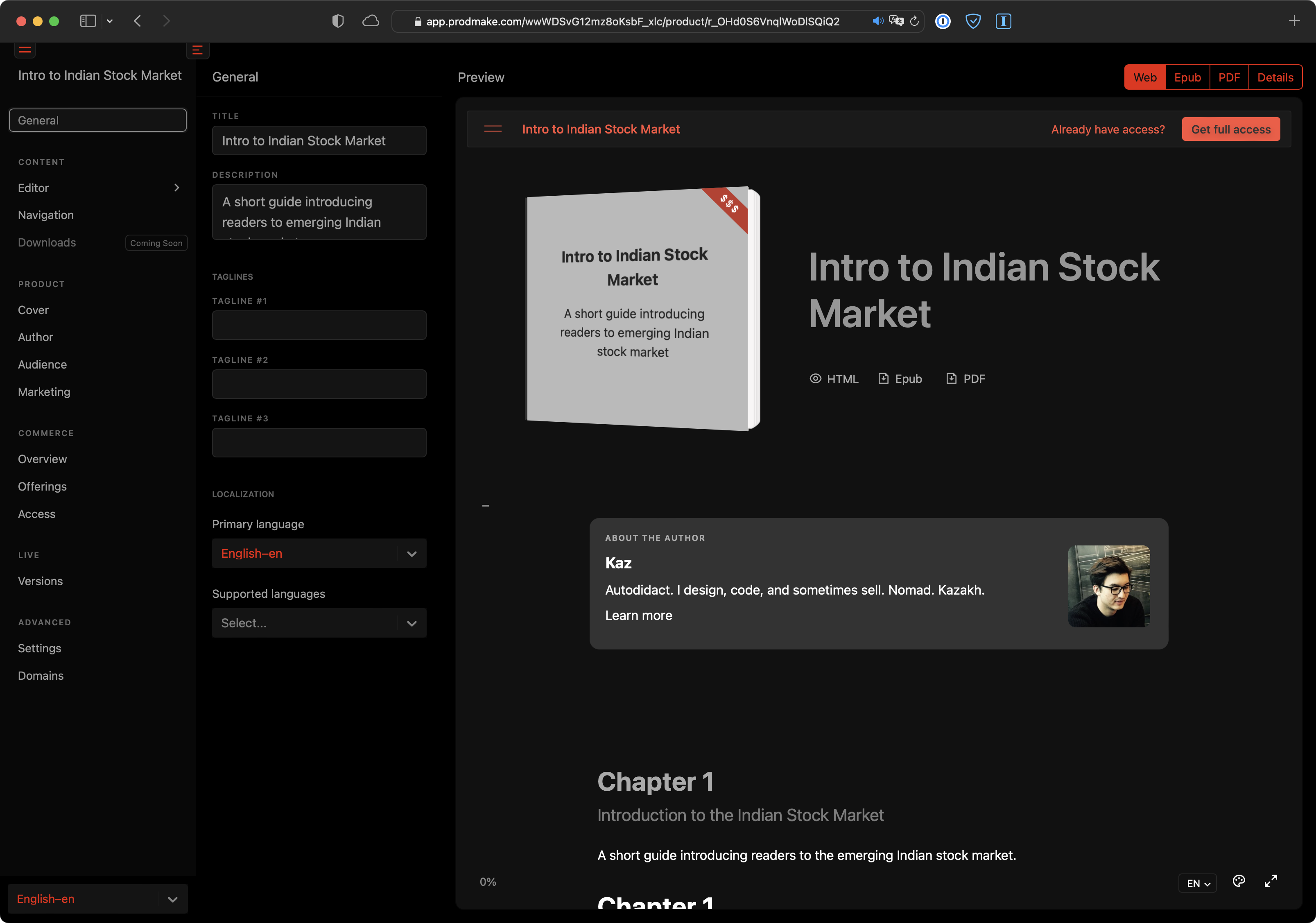 As any other product with exports enabled turning the product into Epub and PDF is a matter of clicking links on a product page.