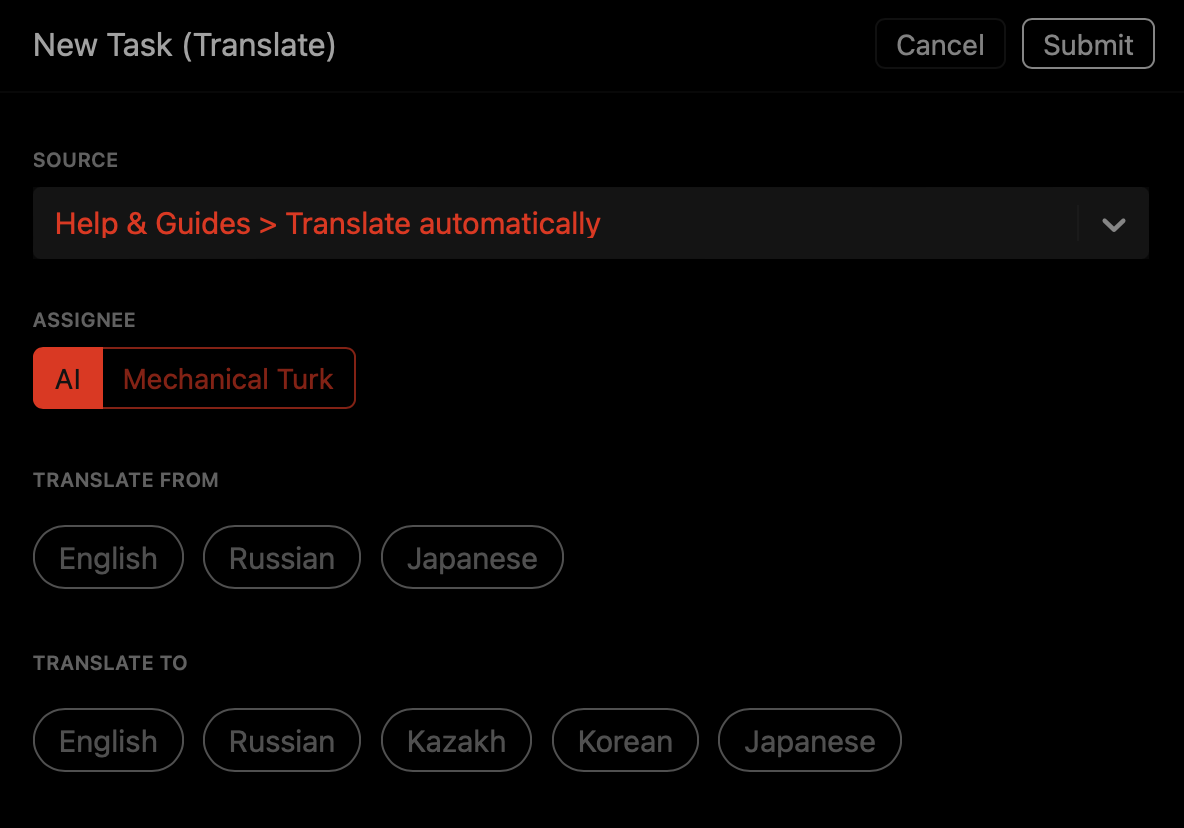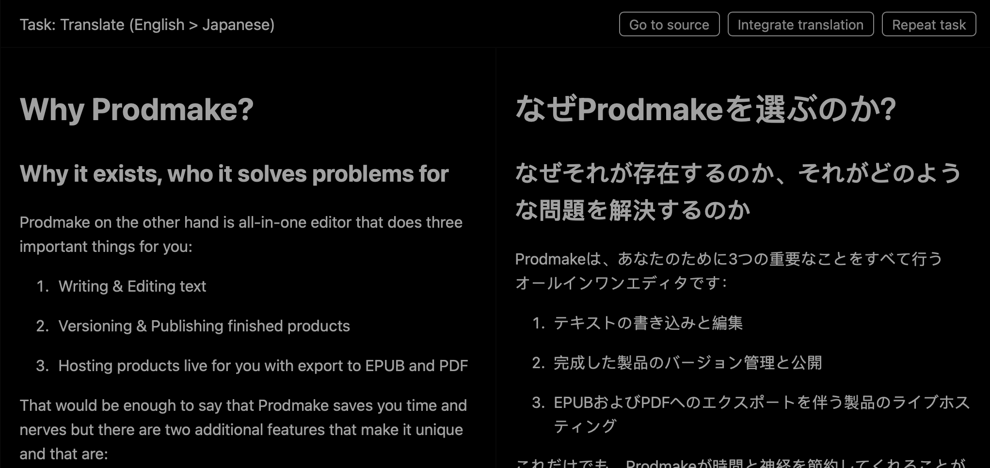 Prodmake Tasks help you utilize AI/LLM technology for “translating” your text.