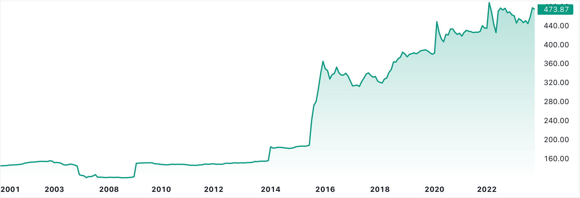 This is a chart of USD/KZT currency pair. KZT is a Kazakhstani tenge, currency of the country where I grew up. 1 USD was equal to 5 KZT when the country declared independence in 1991. In 2023 it’s more than 470 KZT to get same 1 USD (which lost a lot in value too).